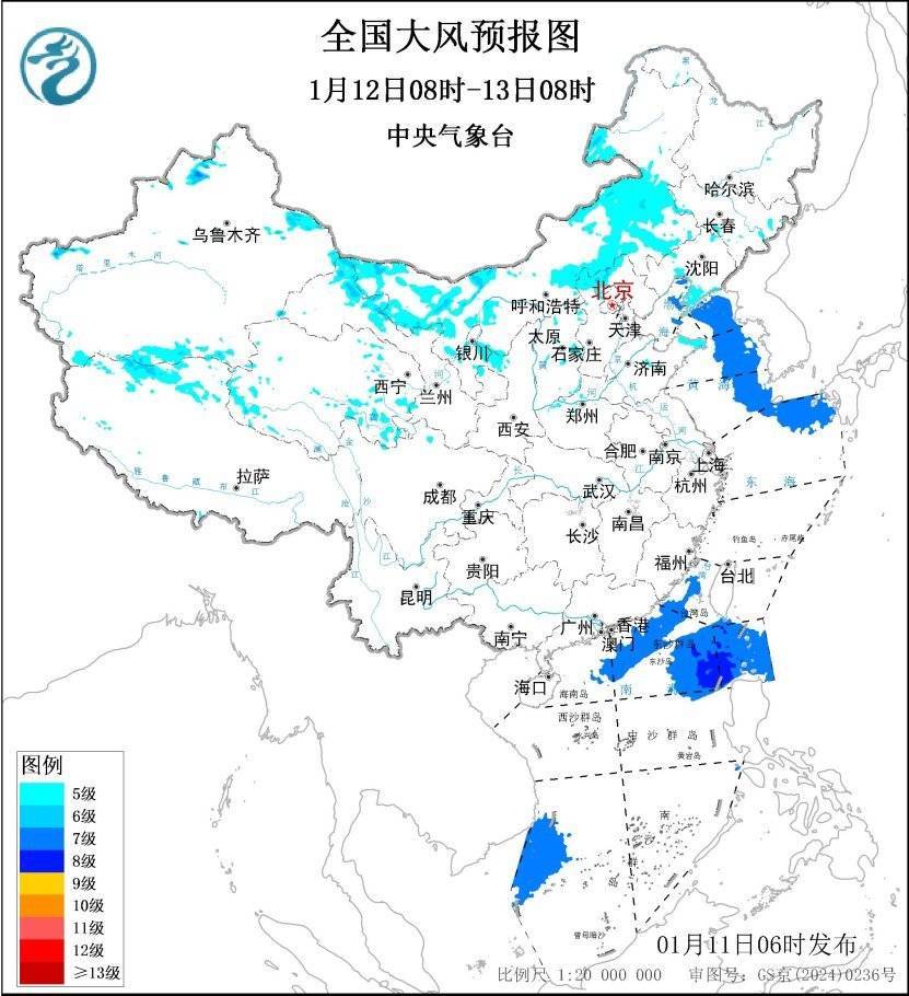 r预计,1月11日08时至12日08时,内蒙古中西部、甘肃西部、宁夏北部、华北北部、山东半岛、辽东半岛、西藏中北部等地部分地区有5~7级大风、阵风8~10级;渤海、渤海海峡、黄海大部海域、东海大部海域、台湾海峡、巴士海峡、南海大部海域将有7~8级、阵风9级的风,其中,台湾海峡、巴士海峡、南海东北部的部分海域将有9级、阵风10级的大风。
