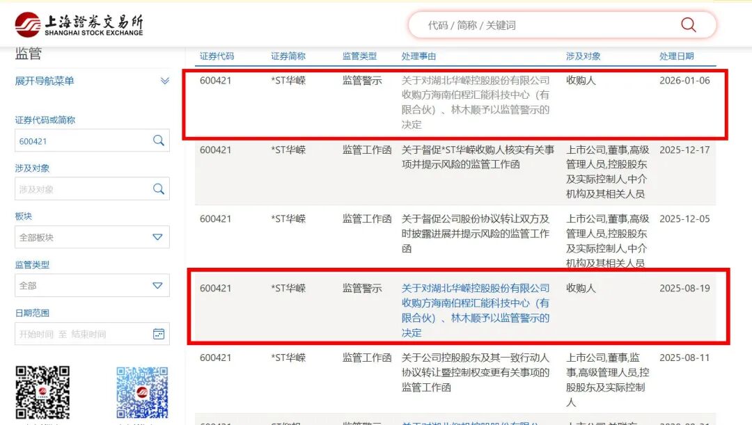 这是本次控制权转让事宜中,海南伯程及其实际控制人林木顺被第二次予以监管警示。2025年8月19日,上海证券交易所官网披露,因未按规则要求在签订股权转让协议后及时披露详式权益变动报告书,也未聘请财务顾问出具核查意见,影响投资者的知情权和合理预期,对*ST华嵘收购方海南伯程、林木顺予以监管警示。